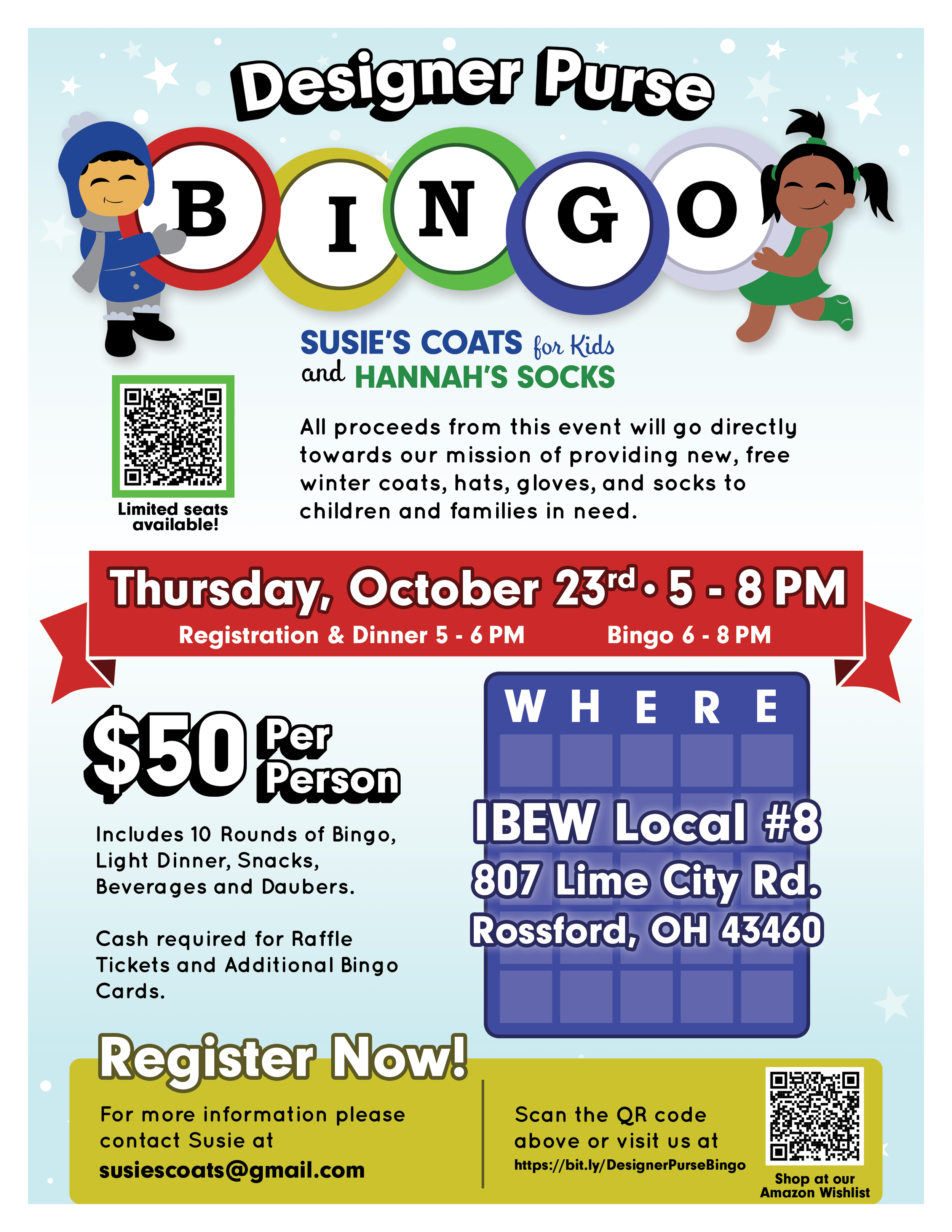 Join us for a fun-filled evening at our 2nd Annual Designer Purse Bingo Fundraiser! Last year’s event received 5-star reviews for the delightful venue, delicious food, exciting raffle prizes, easy accessibility, and seamless organization. This year promises even more fun as we come together for 10 rounds of bingo, great company, and a heartwarming cause. Proceeds benefit Susie’s Coats for Kids and Hannah’s Socks—helping keep children in our community warm all winter long. Don’t miss out—bring your friends and join the fun for a great cause!